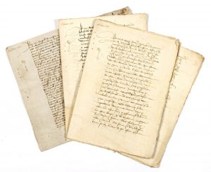 •23 septembre 1489 : 3 pièces concernant le procès intenté par Charles d’Angerville devant le sénéchal d’Alençon, contre Jacques de Silly, sur les droits de la terre du Froult (3 vélins oblong, encre très pâle).