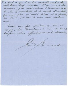 Éluard, collectionneur d’art tribal, de tableaux et de livres surréalistes, fait appel à son mécène et intervient également en faveur d’André Breton, réellement désespéré. En raison de ses difficultés financières et de ses problèmes de santé, Eluard propose de céder à Gaffé certaines pièces de sa collection. Il lui transmet tout d’abord l’origine d’un crâne Pahouin et d’une tête du Cameroun puis lui propose un choix de livres : La vente seule de Littérature ne m’arrangerait pas et voici ce que je peux vous proposer :