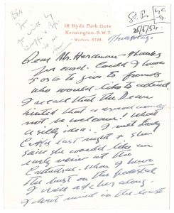 il aimerait avoir son opinion sur les lignes sur lesquelles il est en train de former l’œuvre ; il reste pour l’instant un peu incertain à l’idée de montrer une épreuve à Lady Cripps. Novembre 1953 : il va montrer le buste à Lady Cripps avec appréhension demain ; je pense que j’ai saisi Sir Stafford avec juste esprit. Il n’a pas arrêté de travailler dessus depuis qu’il lui a montré l’œuvre. Mars 1953 : il a été à la fonderie ; plus j’y pense, moins j’aime l’idée de verres sur le buste. Après tout, Dieu a fait Sir Stafford sans lunettes. Ayant fini le buste, il va s’attaquer au socle. 27 mars ; à propos de la réception à la fonderie ; l’ecclésiaste a parlé comme si nous étions en train de commettre un crime… 10 mai : il voudrait voir le bronze en place sur son piédestal avant qu’il ne soit dévoilé pour avoir un avis sur place. 10 juin : le remerciant pour les photos de la grande manifestation, etc.
