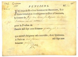 Quittance de 1600 livres pour la pension de l’écrivain, accordée en 1774 par le duc d’Orléans.