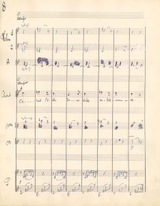 Partition musicale d’une mélodie de Gustave Nadaud transcrite par Hahn pour un ensemble instrumentale de violon, alto, violoncelle, contrebasse et piano, accompagnant le chant.