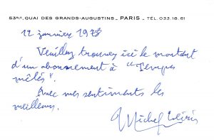 En octobre 1972, Leiris accepte d’envoyer un texte pour l’exposition Queneau organisée par la Bibliothèque du Havre (ville natale de l’écrivain).