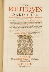[ARISTOTE]. Les politiques d’Aristote, esquelles est montrée la science de gouverner le genre humain en toutes espèces d’états publiques, traduites du grec en français par Loys le Roy dit Regius (…), augmentées du IX et Xes livres (…),...