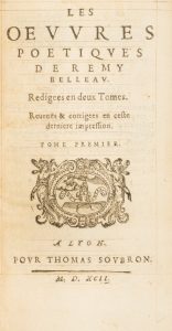 [Remi BELLEAU]. Les oevvres poetiqves de Remy Belleav. Redigees en deux Tomes. Reueuës & corrigees en ceste derniere impression. A Lyon, chez Thomas Soubron, 1592.