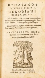 Henri ESTIENNE. [Thucydide]. Thucydidis Olori filius. De bello Peloponnefiaco, libri octo. Iidem Latinè, ex interpretatione Lavrentii Vallæ, ab Henrico Stephano recognita (…). Paris, Henri Estienne, typographe de Huldrich Fugger, 1564.