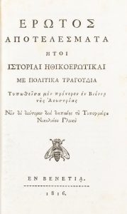 UN OUVRAGE EN GREC, imprimé à Venise : Έρωτος αποτελέσματα ήτοι ιστορίαι ηθικοερωτικαί με πολιτικά τραγούδια. Εν Βενετία, τυπογραφείο Νικολάου Γλυκύ, 1816.