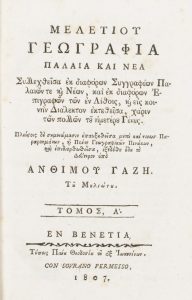 καί τινων Παραρτημάτων, και Πέντε Γεωγραφικών Πινάκων και επιδιορθωθείσα εξεδόθη ήδη το Δεύτερον υπό Ανθίμου Γαζή. Του Μηλιώτου. Εν Βενετία, 1807.