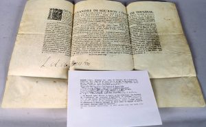 Pièce de parchemin imprimée et manuscrite, 51 x 31 cm. ,