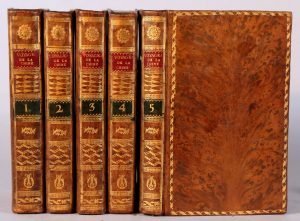 reliés. basane fauve racinée, dos lisses ornés, pièces de titre et de tomaison, dentelle dorée sur les plats.