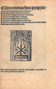 CO[N]TRA MONACHOS PROPRIETARIOS plurimi egregior[um] vivor[um] tractatus. Paris, Gilbert et Geoffroy de Marnef, vers 1505 ;