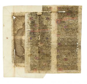 ENLUMINURES du XVe Siècle – 2 Fragments de page calligraphiée et enluminée du XVe s. (qui ont servi de couverture de livre),