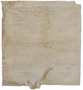 Pardevant Gustave MARIE Garde du Scel des obligations de la Vicomté de ROUEN. Contrat de Bail à rente et fieffe à fin d’héritage à Nicolas BILLARD Huissier Sergent en la Juridiction des eaux et Forêts de la Table de marbre du Palais à ROUEN d’une maison assise en la Paroisse de Saint Victor dudit Rouen – Fait et passé à ROUEN (76) le 12 Février 1572 –