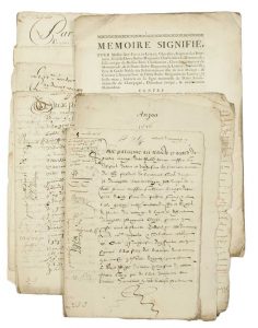(ANJOU. 1576) – 8 PIÈCES concernant la Famille noble DE LESRAT Lieutenant général d’Anjou, Conseiller du Roy au Parlement de Bretagne : 7 Manuscrits (Expéditions maj. in-folio), et 1 Imprimé: 1576.