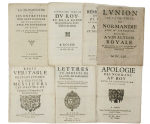 •L’UNION DE LA PROVINCE DE NORMANDIE avec Mrs les Princes envoyée à son altesse Royale, et présentation au Roy en forme de très humble remontrance, par les Députés de ladite Province. » 1652 – Impr. 14 pp. (20,5 x 16,5) –