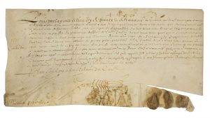 Donné à RENNES le 2 juin 1655 – Parchemin (13 x 27 cm) avec morceaux de sceau de cire Royal (fleur de lys) sur queue –