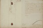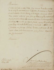 “Monsieur. À mon Arrivée en cette Ville, j’ai trouvé deux des vôtres des 18 et 25 du courant, par lesquelles je remarque toujours la continuation de vos bontés et de votre souvenir. Ainsi vous puis je assurer que j’en ai beaucoup de ressentiment et que je rechercherai les occasions de vous le témoigner. Je resterai ici encore quelques jours, après lesquels je prendrai la route de Provence et ensuite celle de Catalogne, où j’aurai le bien de vous informer de toutes choses ...” –