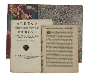 •« Arrest du Conseil du Roy, portant suppression des Droits sur les Eaux-de-vie. » Donnée à Fontainebleau le 6 Octobre 1705. Impr. à Orléans chez Jean BORDE, imprimeur ordinaire du Roi au cloitre St Samson, à la couronne d’Or. 1705 ; 7pp in-4° +