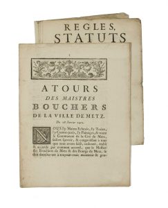 •« Règles Statuts atours, et annexes, aux anciens des Maitres-Six, Corps, Métier, & Communauté des TONDEURS DE DRAPS de la Ville de METZ ; qui seront gardés & conservés, tant pour la manutention des droits & Police dudit Corps, & retranchements des abus qui s’y étaient glissés… » -