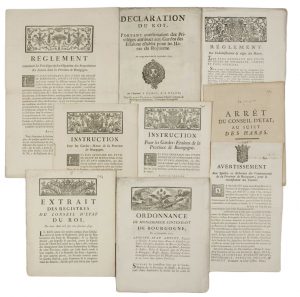 •« Arrest du conseil d’État au sujet des Haras. 1766 » Impr. à Dijon, chez A. Defay ; 7pp in-4° + « Avertissement aux sindics ou Échevins des Communautés de la province de Bourgogne, pour le recensement des Juments. » Dijon 2 Nov. 1766 ; 1p in-4° +