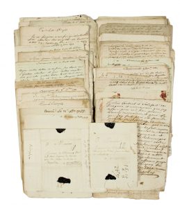 (AUDE. CHÂTEAU DE MALVES) – Correspondance de 95 Lettres et quelques documents, maj. XVIIIe S., (de 1724 à 1808) adressée à Mr De VILLEPEIROUX Chevalier de Saint Louis, Seigneur de MALVES habitant son Château de MALVES en Languedoc, à...