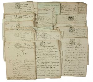 ALLIER – BOURBONNAIS - Archive de 49 Expéditions timbrées de la Généralité de MOULINS, en majorité du XVIIIe s. (de 1736 à 1807) concernant des Habitants de l’ALLIER. (Quelques parchemins.) :