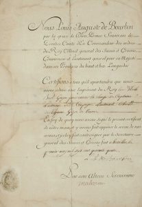 (SUISSES & GRISONS) – Pièce Signée « Louis Auguste de BOURBON, Prince Souverain de Dombes, Comte d’EU, Commandeur des Ordres du Roy, Colonel général des Suisses et Grisons, Gouverneur et Lieutenant Général dans les Provinces du Haut et Bas...