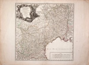 CARTE DU LANGUEDOC, époque Louis XV – « Gouvernement Général du Languedoc divisé par Diocèses, avec les pays voisins de la Catalogne, qui comprennent les Gouvernements généraux de FOIX et de ROUSSILLON, par le Sieur ROBERT, Géographe...