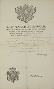P.S. « Le Maal Duc de BROGLIE » à son entête gravé, à ses nom et titres, en tant que « Maréchal de France, Gouverneur des Ville et Château de BÉTHUNE, Commandant en Chef la Haute et Basse ALSACE et de l’armée de Sa Majesté sur le Haut-Rhin. » –