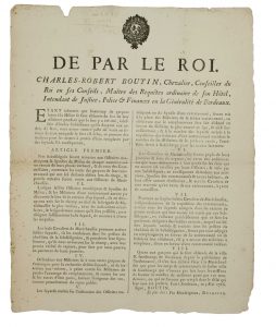 Arrêté,« De par le ROI. De Charles Robert BOUTIN, chevalier, Conseiller du Roi, Intendant en la Généralité de BORDEAUX» (En-tête) –