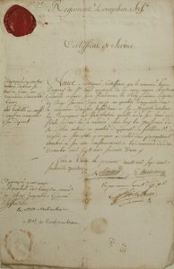 pendant la Terreur. Certificat de services signée “le Cte de ROCHAMBEAU” Le Maréchal de Camp des Armées du Roy, Inspecteur Général d’Infanterie - Régiment DAUPHIN INFANTERIE – en faveur de “ Pierre DUQUAY .., Lieutenant-Colonel ayant servi fidèlement le Roy pendant l’espace de vingt six ans, dont 12 .. dans le Régiment Dauphin Infanterie...” - Fait à CAEN (14), le 1 août 1774 - “....