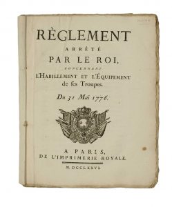 (L’UNIFORME POUR LA GUERRE D’AMÉRIQUE.) – « Règlement arrêté par le Roi (Louis XVI), concernant L’HABILLEMENT ET L’ÉQUIPEMENT de ses Troupes. Du 31 Mai 1776. À PARIS, de l’Imprimerie Royale –