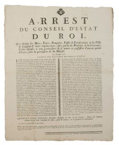 CAUSSADE (TARN-ET-GARONNE) – « Arrest du Conseil du Roi (Louis XVI) qui déclare les murs, tours, remparts, fossés & fortifications de la ville de CAUSSADE (82) & leurs emplacements, faire partie du Domaine de la couronne; et fait défenses à...