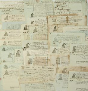 56 Connaissements (vignette au voilier). Comptes de sucres, café, blé, etc. (1714) Divers papiers concernant une avarie de bateau et frais de sauvetage d’une cargaison à LA CIOTAT en 1789. 14 Lettres de change.
