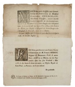 •Placard mortuaire (44 x 55) de « M. Bernard BONNEMAIN, Marchand Tapissier, ancien Syndic Garde-Comptable de sa Communauté, décédé dans sa maison, Cloître Saint Jacques-de-Hôpital » ; Convoi, service et enterrement le 29 Septembre 1783 en l’Église Collégiale de Saint Jacques-de-l’Hôpital. (Lettrine macabre) –