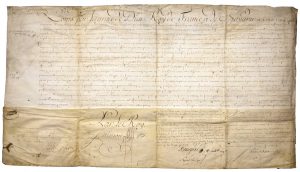 Lettres patentes, données au nom du Roi LOUIS XVI Roy de France et de Navarre, au Sieur Louis de LAVAUR Docteur en Droit. Il a été reçu en l’Office de Conseiller du Roy, Trésorier de France et Général de ses finances en la Généralité de MONTAUBAN. Donnons au Sieur FLEURIAU D’ARMENONVILLE de le Recevoir –