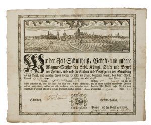 Traduction : « Nous, actuellement « Schultheiss, Gebott » et autres Maîtres-charrons de la Ville royale et du canton de Colmar et d’autres villes et communes de Strasbourg à Bâle et entre les deux ponts d’alsace, Certifions par la présente que le Compagnon…, né le... âgé de… Taille :… cheveux … habillement… a travaillé chez nous. Il s’est montré durant cette période, comme il convient à tout Compagnon artisan, fidèle, appliqué, honnête ce que nous attestons par la présente ; nous invitons donc tous nos confrères Maîtres, de soutenir ce Compagnon, conformément à nos traditions. Fait à Colmar le 12 avril 1788. » -