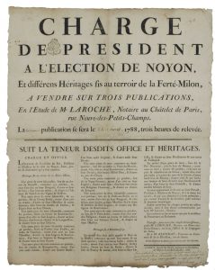 PICARDIE. 1788) – « CHARGE DE PRÉSIDENT À L’ÉLECTION DE NOYON (60), et différents Héritages sis au terroir de LA FERTÉ-MILON (02), à VENDRE sur trois publications, en l’étude de Me LAROCHE, notaire au Châtelet de PARIS, rue...
