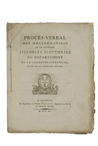 « Procès-Verbal des délibérations de la Première Assemblée Électorale du Département de la Charente Inférieure, tenue en la Ville de SAINTES. » -