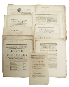 HAUT-RHIN – (Alsace) – Collection de 27 IMPRIMÉS sur le HAUT-RHIN, sur la Révolution et l’Empire, imprimées à COLMAR, chez DECKER, imprimeur de la Préfecture du Haut-Rhin de 1791 à 1822 (Nombreux textes bilingues : français/ Alsacien.)...
