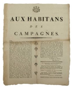 « Digne portion de la Société, Habitants des Campagnes, un grand danger menace vos habitations ; des brigands dévastateurs s’avancent vers elles ; Ils y porteront le fer et le feu. … je vous invite et vous presse… Hâtez-vous de réaliser vos moissons, de faire battre & transporter tous vos grains, soit dans Paris, soit dans quelqu’autres villes de l’intérieur de l’Empire… sous la Garantie Nationale… » -