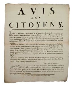 •« Lundi 11 Mars 1793… dans l’Église des ci-devant Récollets de LILLE, la vente considérable des linges et ornements d’Église se continue toujours….