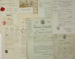 ARDENNES) – Papiers militaires des citoyens GUYON demeurant à VERPEL (08) . 15 Pièces de 1793 à l’An 9 Henry GUYON Maréchal des Logis, Urbain GUYON Dépensier de l’Hôpital d’Ostende, à Gand, commis aux écritures à la suite des...