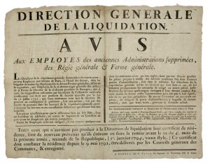 « Le Directeur de la Liquidation générale donne avis à ses concitoyens anciens Employés aux Entrées de Paris, à l’Hôtel des Fermes, dans les brigades de toutes les directions des ci-devant Fermes générales, débitants & Regrattiers, aux Employés de la ci-devant Régie générale des Aides, de la Ferme de Devoirs de la ci-devant province de Bretagne, qui, à cause des suppressions ordonnées par les Décrets de l’Assemblée Nationale constituante ont droits aux pensions & secours accordées par la Loi du 31 Juillet 1791, que leurs traitements sont faits et décrétés. Ils peuvent en conséquence se présenter… pour y recevoir les brevets ou reconnaissances définitives… » -