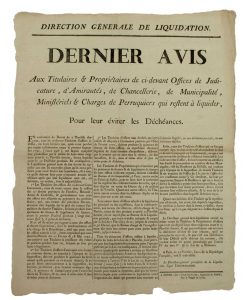 « Direction générale de Liquidation » « Dernier Avis aux Titulaires & Propriétaires de ci-devant Offices de Judicature, d’Amirautés, de Chancellerie, de Municipalité, Ministériels & Charges de PERRUQUIERS qui restent à liquider, pour leur éviter les déchéances. »