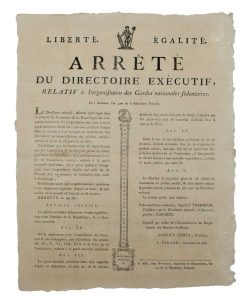 (BOUCHES-DU-RHÔNE) – « Arrêté du Directoire Exécutif, relatif à l’organisation des GARDES NATIONALES SÉDENTAIRES. Du 2 Germinal An 4. (22 Mars 1796) » LE TOURNEUR Président. – Publié par le Département des Bouches-du-Rhône. –...