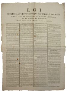Beau texte reprenant le contenu de l’important Traité de Campo-Formio du 26 vendémiaire an 6 (17 octobre 1797) ainsi que les résolutions adoptées par le Conseil des Anciens et le Conseil des Cinq-Cents pour le ratifier. Le Traité de Campo-Formio est signé par Napoléon Bonaparte Général en Chef de l’armée française en Italie. Il met fin (provisoirement) à la guerre franco-autrichienne et contient des clauses territoriales importantes :