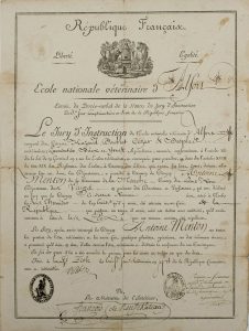 ÉCOLE NATIONALE VÉTÉRINAIRE D’ALFORT » (94) – Diplôme de Vétérinaire délivré à Antoine MENTON de la commune de LA MARCHE (Vosges) – Fait à ladite École le 3 Vendémiaire An 7 (1798) – Vignette représentant des animaux et une...