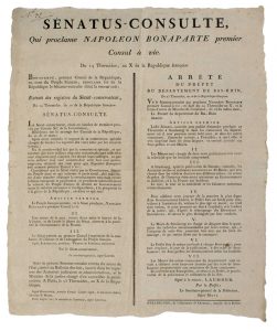(BAS-RHIN. BONAPARTE CONSUL À VIE. 1802) « - « Sénatus-Consulte, qui proclame NAPOLÉON BONAPARTE Premier Consul à Vie. Du 14 Thermidor An 10 (2 Août 1802) » - Impr. à STRASBOURG (67), de l’Imprimerie de LEVRAULT, Impr. de la Préfecture -