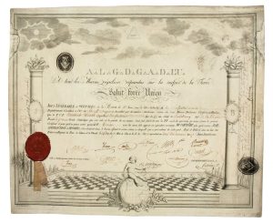 BREVET de FRANC-MAÇONNERIE de 1802 – « LOGE DE LA PARFAITE UNION À L’ORDRE DE LA 98EME DEMI-BRIGADE » (Cachets noir et Sceau de cire rouge pendant.) –