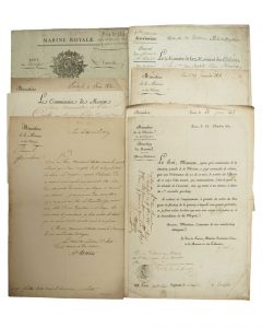 MARINE – Carrière de Jean Baptiste Alexis FRADIN Contre-amiral : 15 pièces signées de l’an 11 (1803) à 1828, de Paris et du Port de ROCHEFORT (17) –